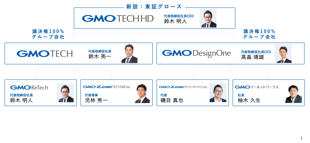 GMO TECHホールディングスは、共同持株会社として、傘下グループ会社および連結企業群の経営管理に特化した事業を行います。なお、GMO TECHおよびGMOデザインワンをはじめとするグループ会社の事業内容に変更はなく、この2社を中核事業会社としたグループ経営体制により、企業価値の最大化を目指してまいります。