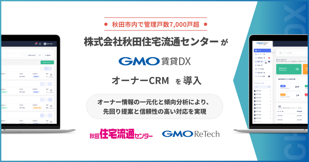 GMOインターネットグループのGMO TECHホールディングス株式会社の連結会社で、不動産賃貸領域におけるDX(デジタルトランスフォーメーション)を支援するGMO ReTech株式会社(代表取締役社長:鈴木 明人 以下、GMO ReTech)は、不動産管理会社向けCRMツール『GMO賃貸DX オーナーCRM』を、株式会社秋田住宅流通センター(以下、秋田住宅流通センター)に導入いただきました。運用開始は、2025年11月を予定しています。