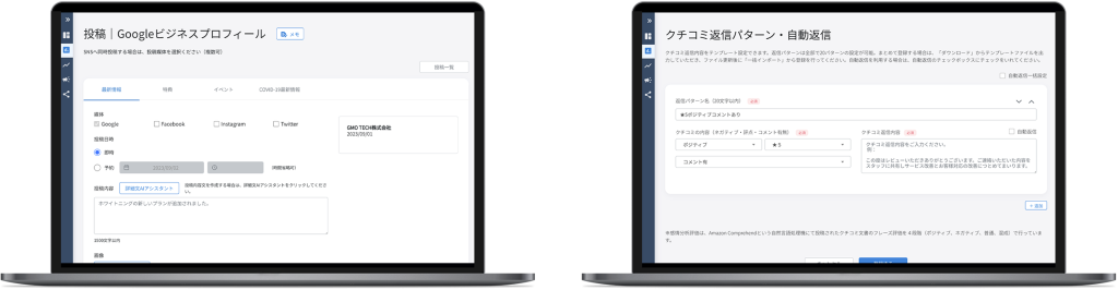 Googleビジネスプロフィール上の店舗情報やクチコミを一括で管理。また、AIによる自動返信や、クチコミ投稿促進などの機能により、複数店舗を持つ不動産会社でも一元管理が可能となり店舗の情報更新やクチコミ管理を効率化します。