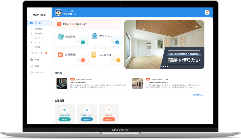 本サービスは、従来のスマートフォン向けアプリ『GMO賃貸DX 入居者アプリ』と同等の機能を、PCやタブレットなどのWEBブラウザ上で利用できるものです。アプリのインストールが不要なため、スマートフォンを使用しない入居者や、より大きな画面での操作を希望する入居者を含む、幅広い層にとってより利便性の高いサービスとなりました。これにより、不動産管理会社は多様な入居者に対応可能となります。