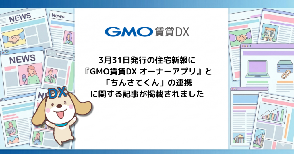 弊社が提供する不動産管理会社向けオーナーアプリ『GMO賃貸DX オーナーアプリ』と、株式会社住宅テックラボが提供するAI賃料査定ツール「ちんさてくん」の連携開始に関して、3月31日発行の住宅新報に掲載されました。